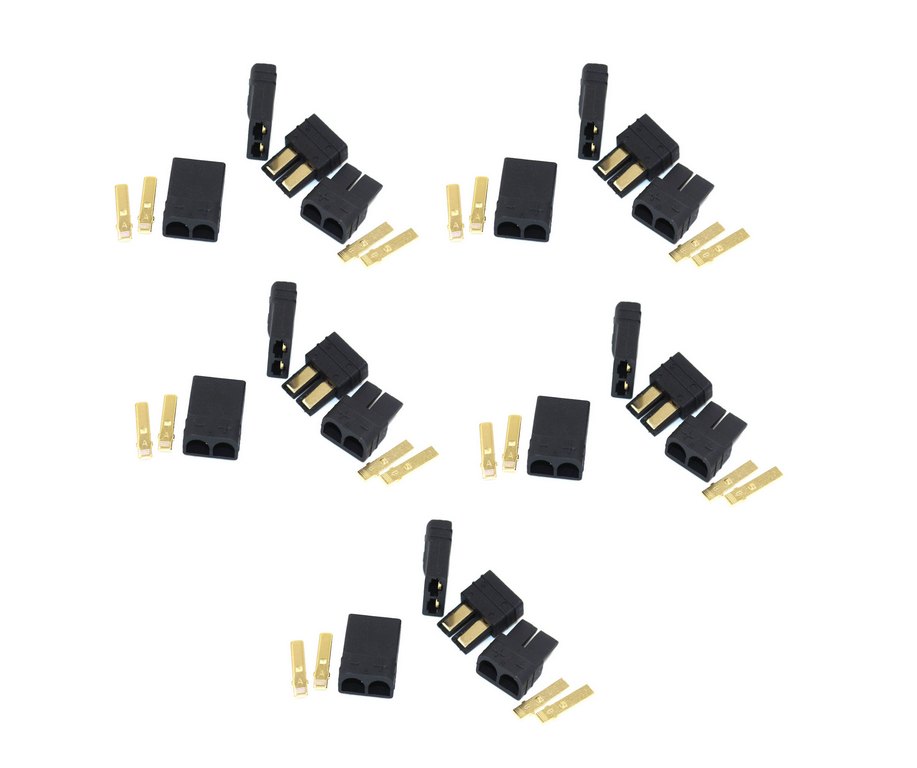 TRX Stecker/Kupplung Verbindungssystem, gloßflächige Goldkontakte, einfaches Verbinden und Lösen durch große Grifffläche, verpolungssicher durch nummerierte Hülsen, Strombelastbarkeit bis 50A, Größe (LxBxH)mm: 37x16x8,5mm. Lieferumfang: 5stk Buchsenhülsen A, 5stk Steckerhülsen B und 20stk Goldkontakte.